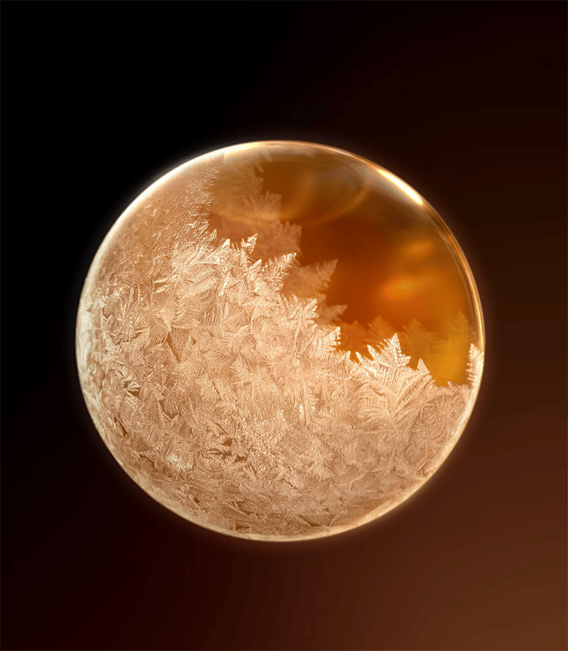 每粒冻干球浓蕴精选冻龄成分,蕴含 20% 的抗坏血酸葡糖苷、透明质酸和黑蜂蜂蜜。各种成分全部融于水溶液中,注入球形模具,以获得创新有机成分。随后,经 -40°低温冷冻和脱水处理,制成融蕴 100% 源自天然活性成分精萃的冻干球。