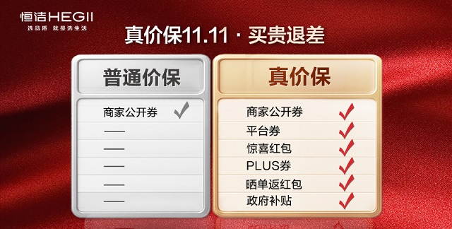 面向2025年双11,恒洁京东自营旗舰店将进一步升级消费体验,率先推出「真价保」服务——涵盖平台补贴、优惠券、红包等所有公开可得优惠,买贵即退差,彻底打破价格迷雾。