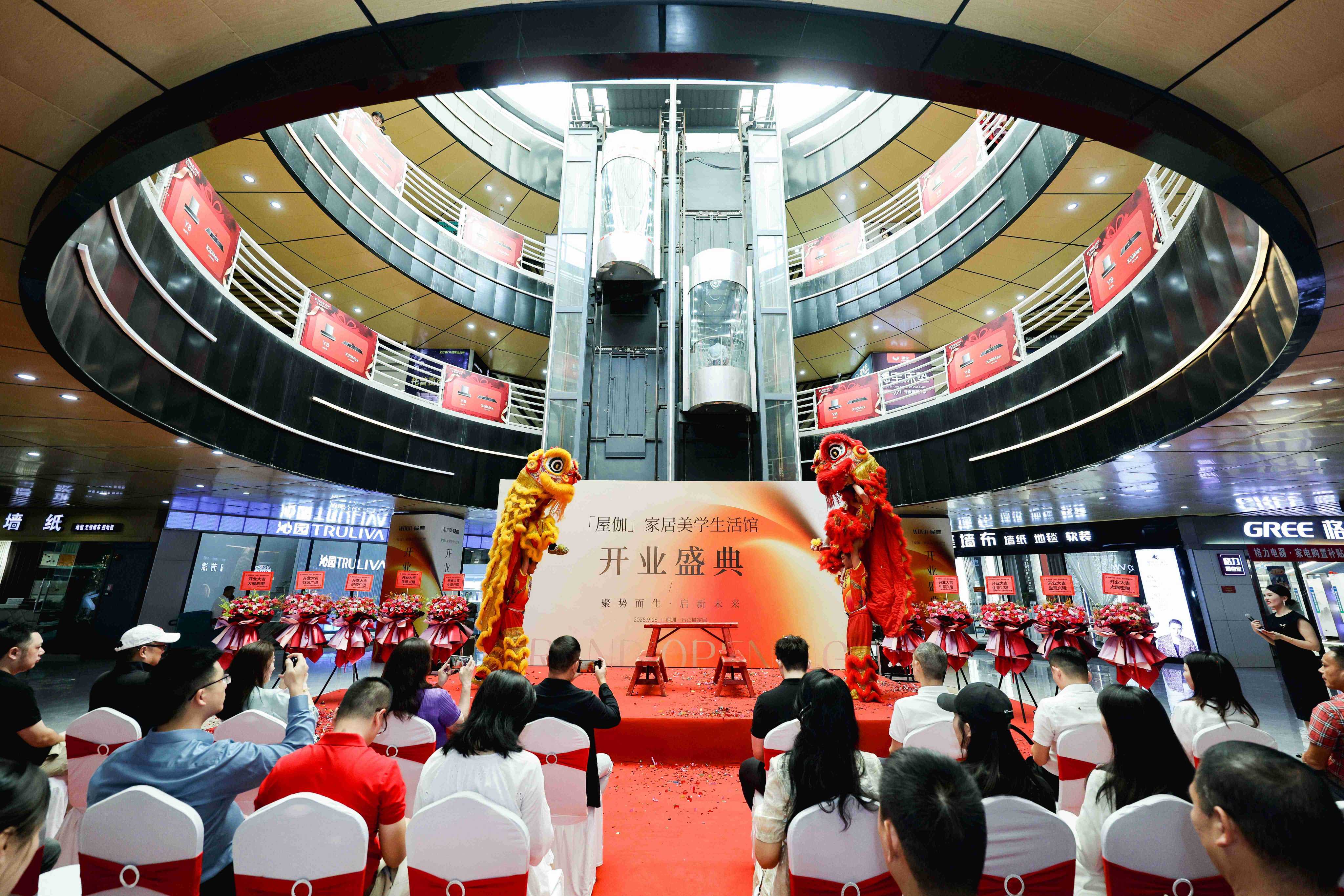 随后,钟华董事长、钟乔副总裁与企媒嘉宾共同完成剪彩,礼花齐放间,WOGA 屋伽“双核引擎”正式全速启航;祥狮点睛环节,钟华董事长以 “一点兴隆、二点广进、三点前程” 赋予品牌吉祥寓意,醒狮起舞烘托氛围,象征产业升级新程的开启。