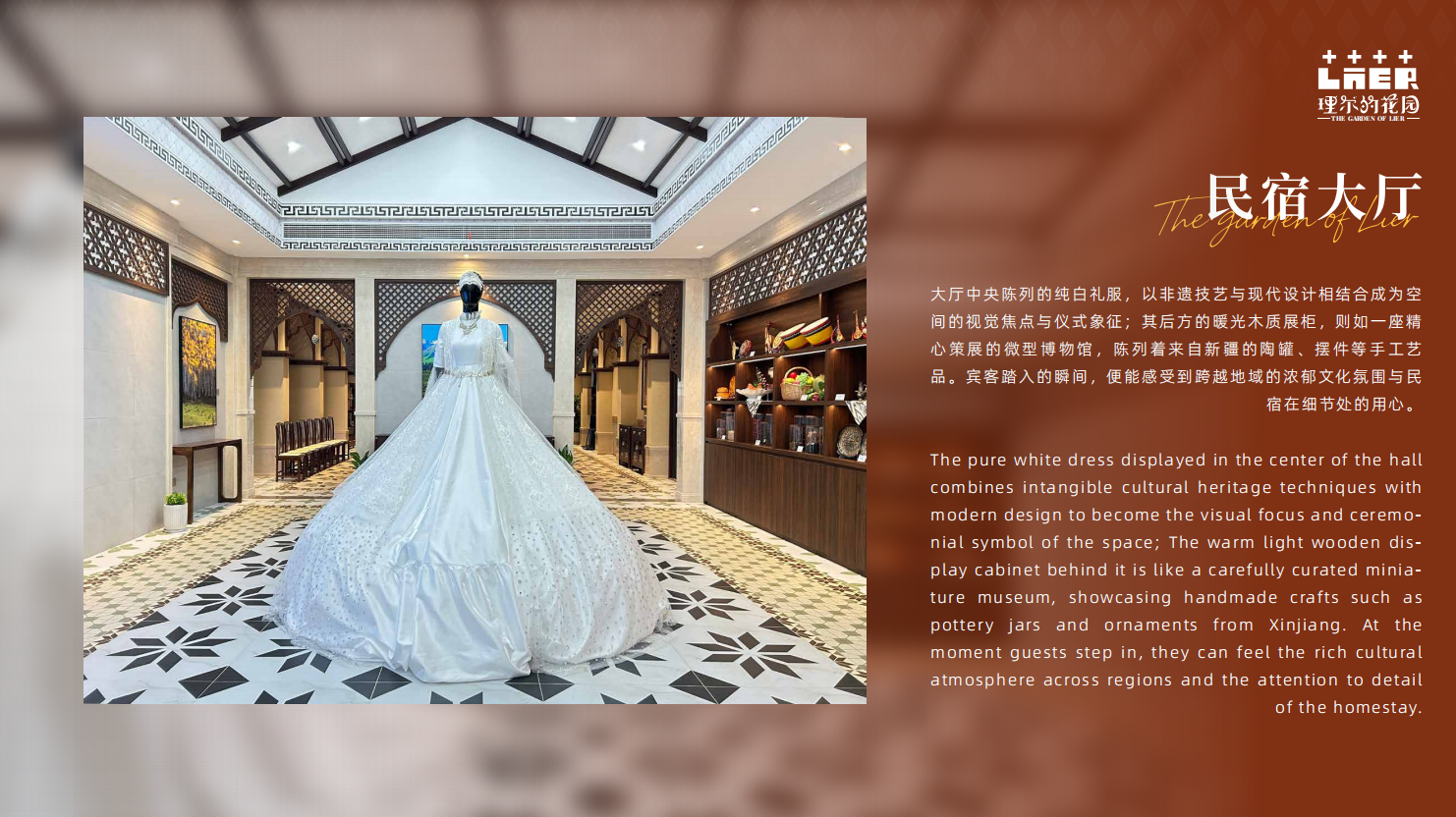 这款融合维吾尔族元素的婚纱设计,其外搭部分采用了繁复的重手工工艺。我们原创设计了艾德莱斯纹样,并通过精细刺绣将其呈现于面料之上。同时,运用手工缝缀的珠子、亮片及水钻,精心制作出巴旦姆花纹作为核心装饰元素。头饰设计灵感源自维吾尔族传统皇室皇冠,进行了现代复刻与演绎。内搭裙身使用了长达120米的轻盈薄纱作为内衬,外层主体则选用了60米光泽柔和的新疆绸缎。