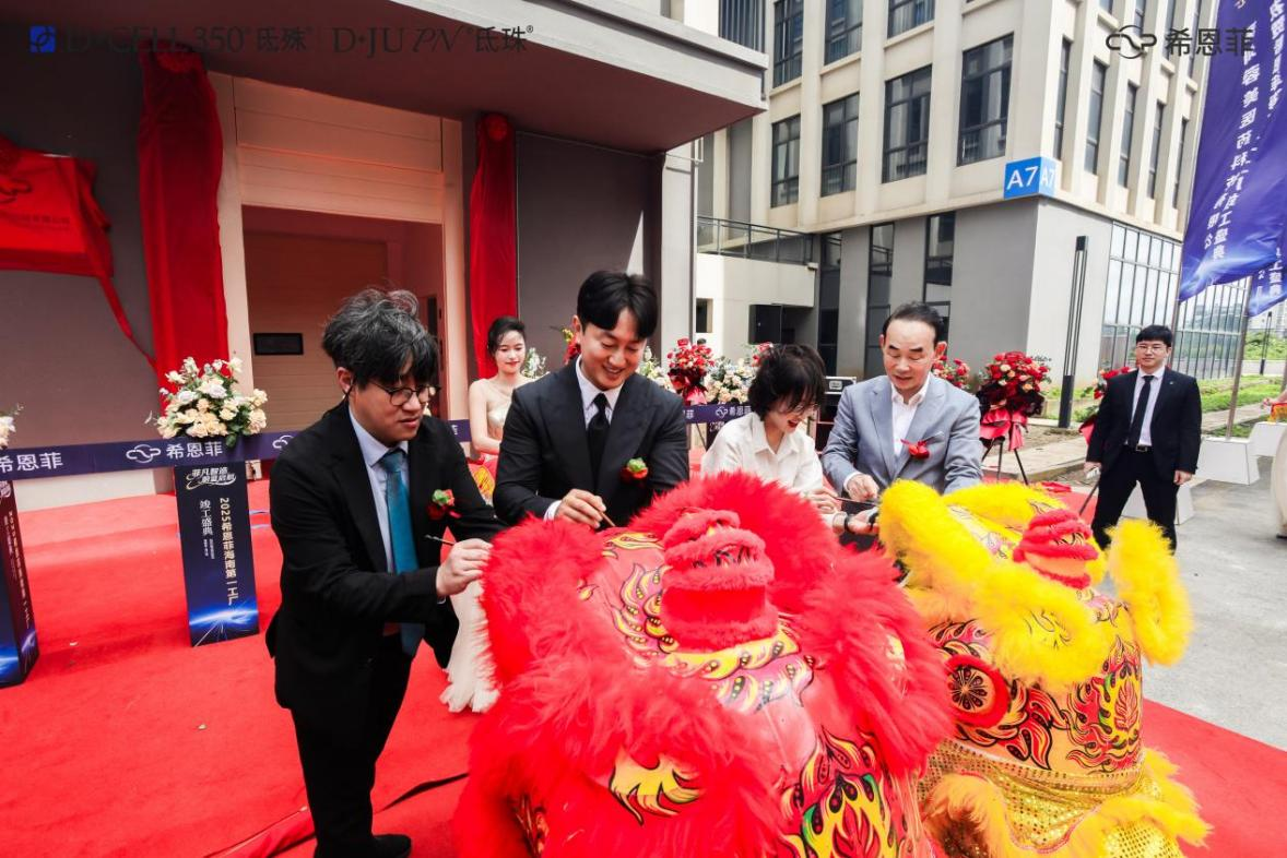 竣工盛典现场气氛热烈,声声礼炮响彻云霄,寓意事业红火、宏图大展。传统金狮点睛环节唤醒祥瑞之气,象征着智造新生与产业腾飞。在权纯杰董事长与郑尚洙会长的共同见证下,希恩菲海南智造基地正式揭牌,标志着国际标准工厂全面投入运营,开启了希恩菲在医疗创新领域的新纪元。